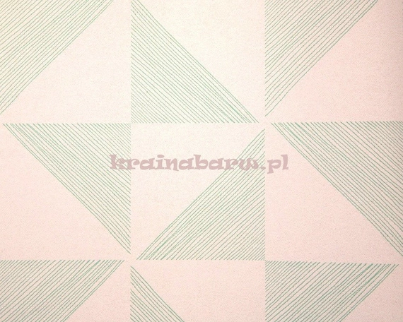 Tapeta z geometrycznym wzorem. Układa się on w trójkąty. Część z nich składa się z pasków. Szarawo zielona kolorystyka.