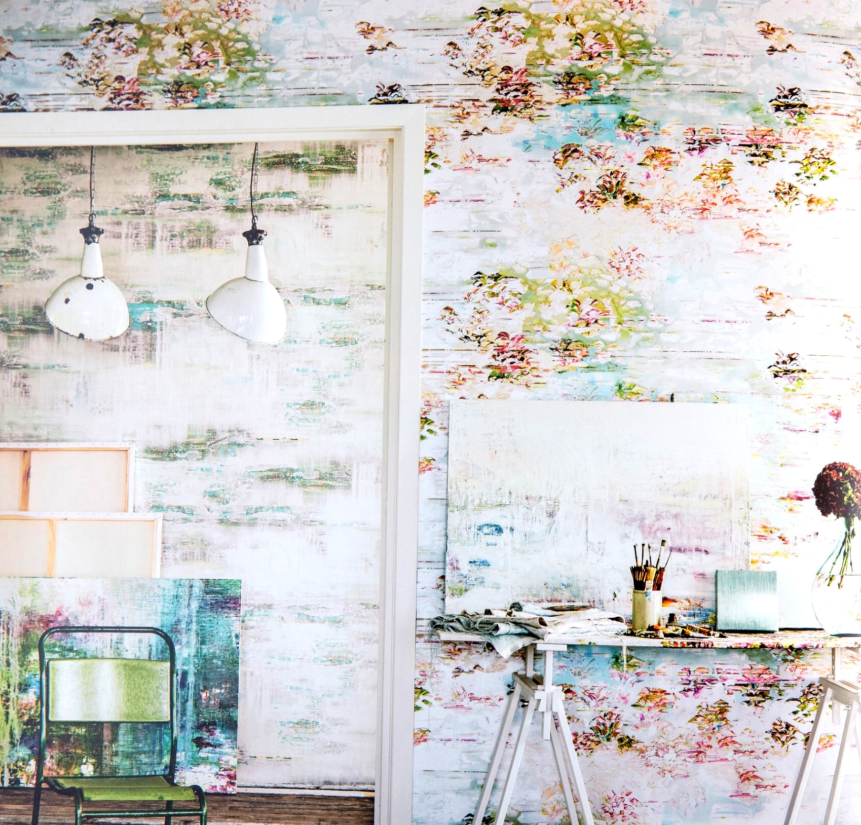 Tapeta Pleasure Gardens jest artystyczną wizją kwiatów w ogrodzie. Jej powierzchnia wygląda na ręcznie malowaną. Na tapecie widać zróżnicowaną kolorystykę- róż, błękitny, zielony, szary.