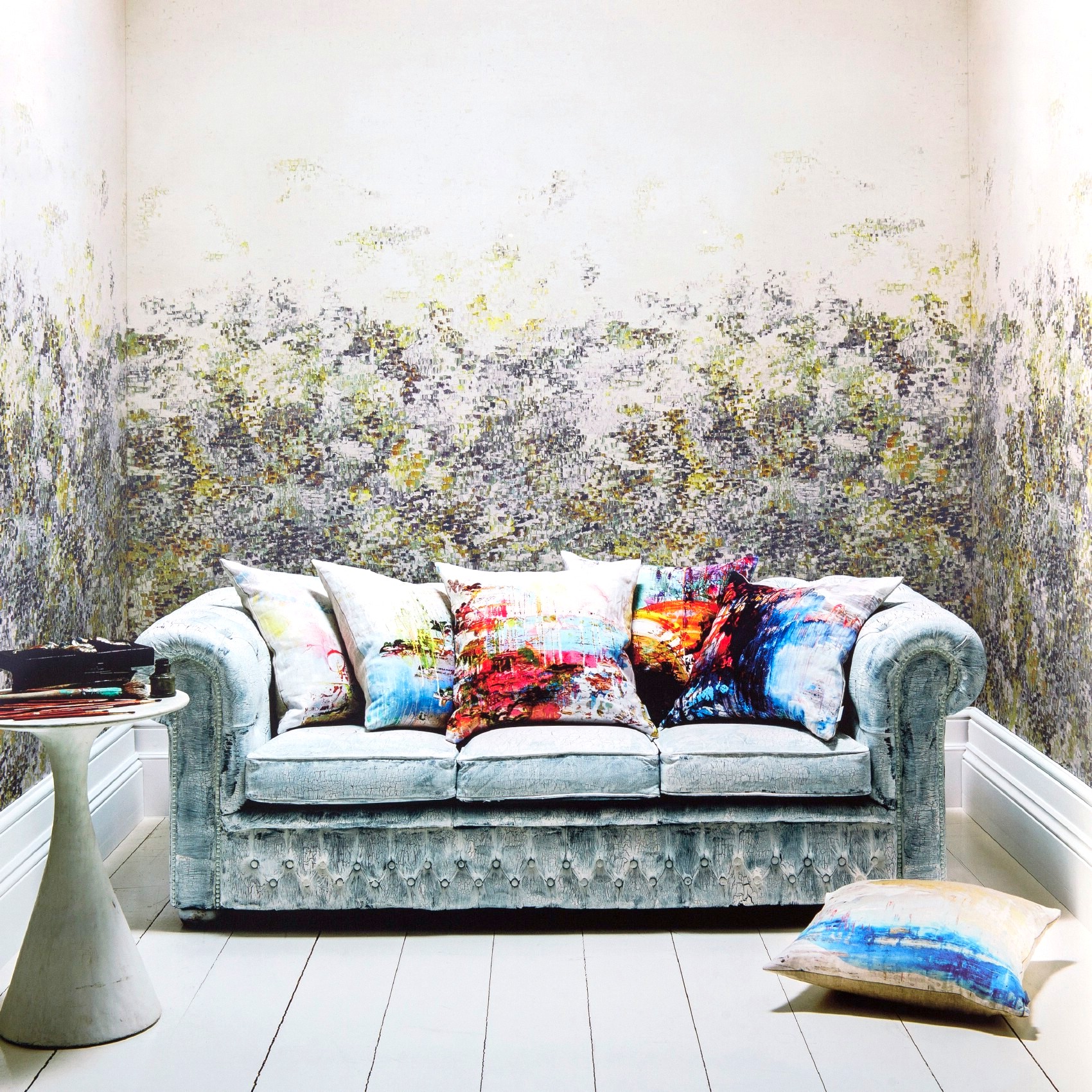 Panel Breathe jest doskonałym uzupełnieniem tapet z kolekcji. Składa się z 4 części: 2x rolka A, 2x rolka B. Nakłada je się naprzemiennie ABAB. Górna część jest jednokolorowa, natomiast na dole widać abstrakcyjną wielokolorową mozaikę.