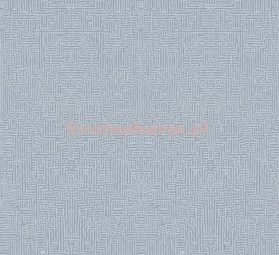 Tapeta z geometrycznym wzorem, labiryntem. Srebrzysto niebieska kolorystyka z delikatnym połyskiem.
