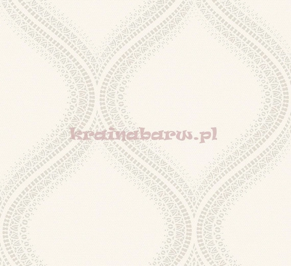 Tapeta z ornamentem inspirowanym blisko wschodnimi zdobieniami. Biało-srebrzysta kolorystyka z delikatnym połyskiem.