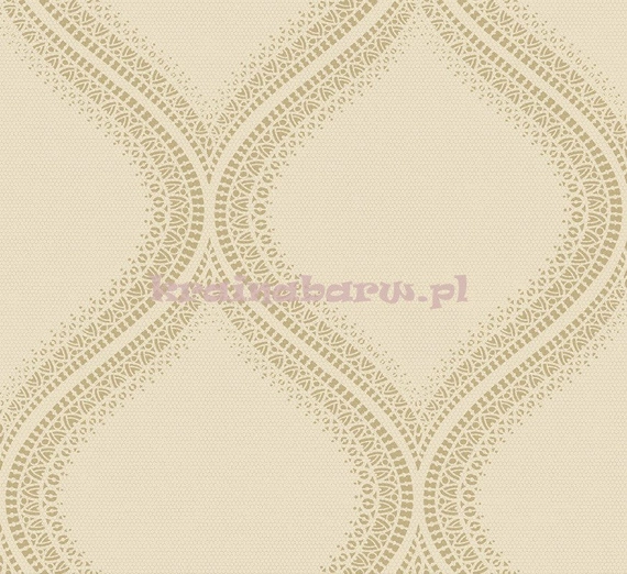 Tapeta z ornamentem inspirowanym blisko wschodnimi zdobieniami. Naniesiony wzór jest pokryty kwarcem. Beżowa kolorystyka z delikatnym połyskiem.