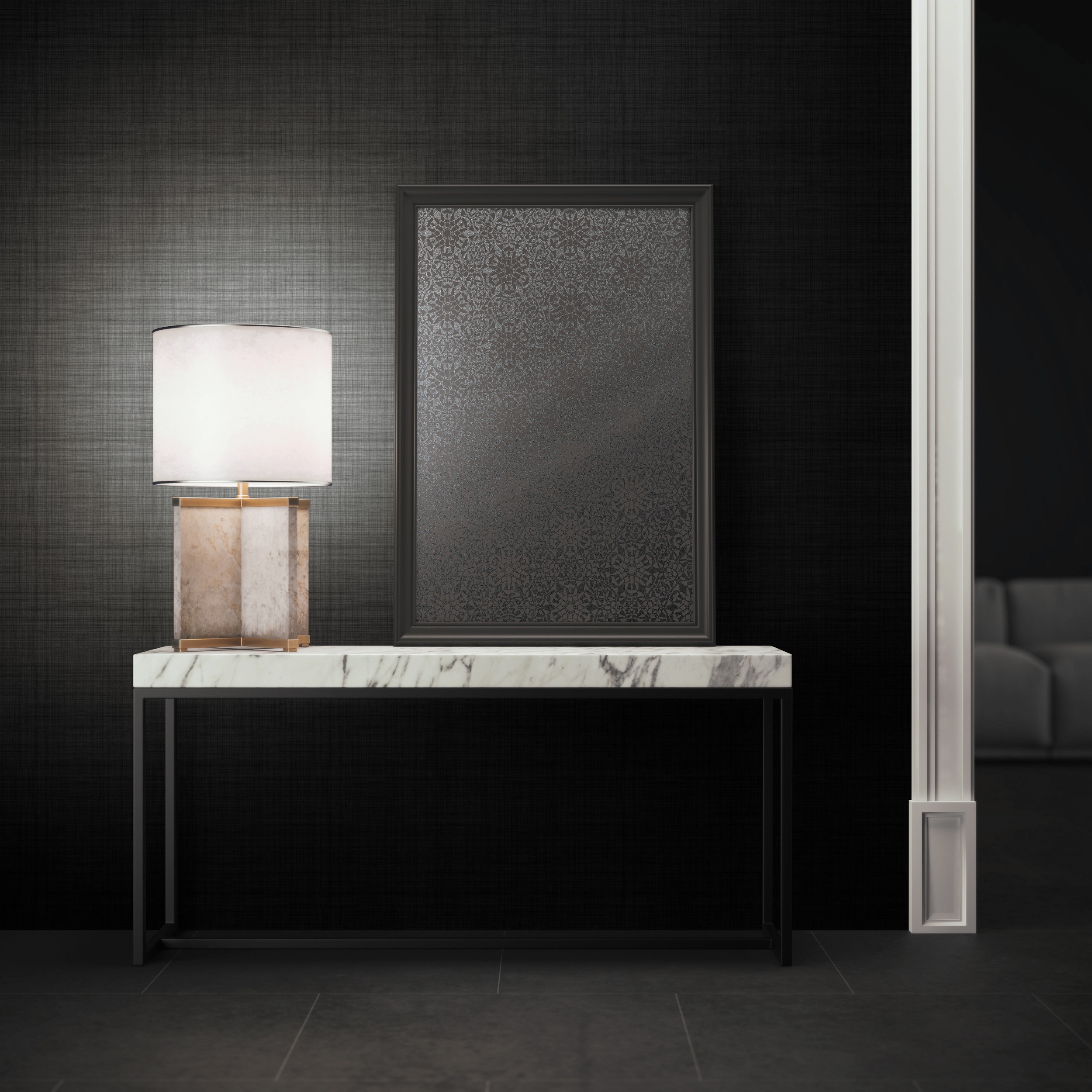 Jednokolorowa tapeta w drobną kratkę. Czarny kolor z delikatną srebrzystą kolorystyką.