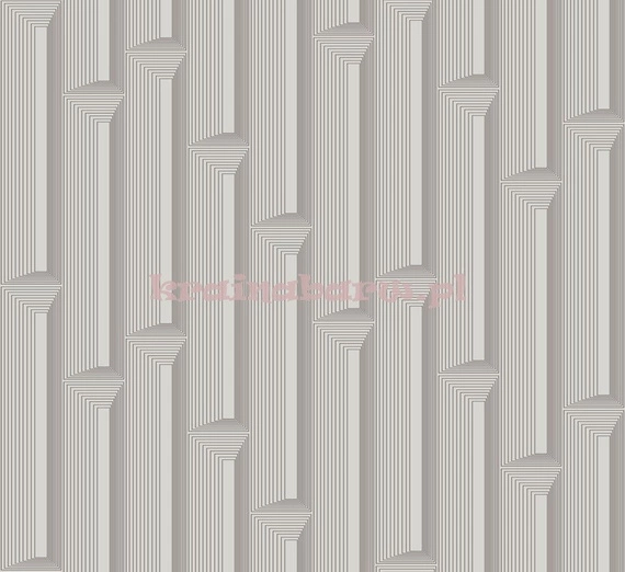 Tapeta z geometrycznym wzorem, składającym się z prostokątów. Układa się on w nieregularne pasy. Kolor srebrzysto-beżowy.