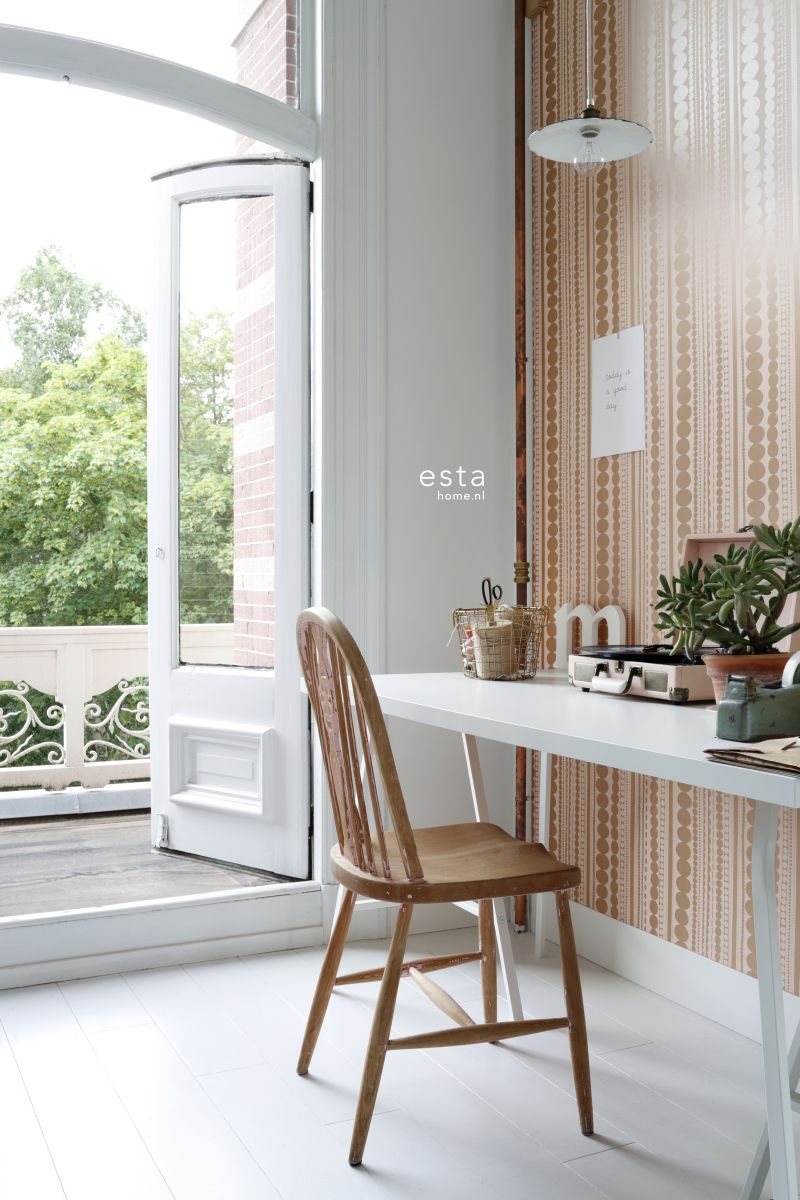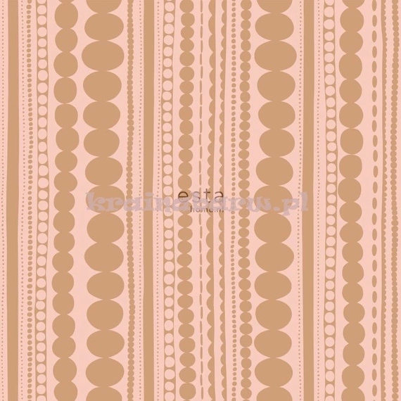 Tapeta w pasy składające się z kółek, kropek i szlaczków. Złocisto różowa kolorystyka.