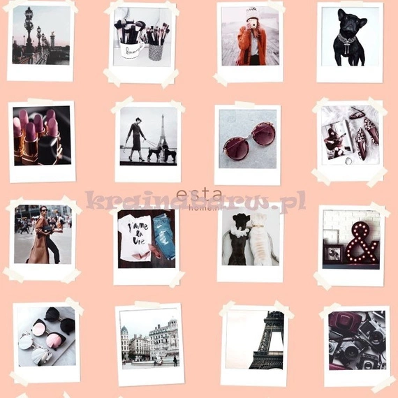 Tapeta z różnymi zdjęciami, które znajdują się na różowym tle. Idealne do pokoju dla nastolatki.