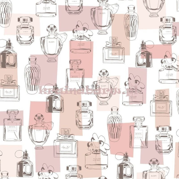 Tapeta z perfumami. W tle znajdują się różowe kwadraty. Idealne do pokoju dla nastolatki.