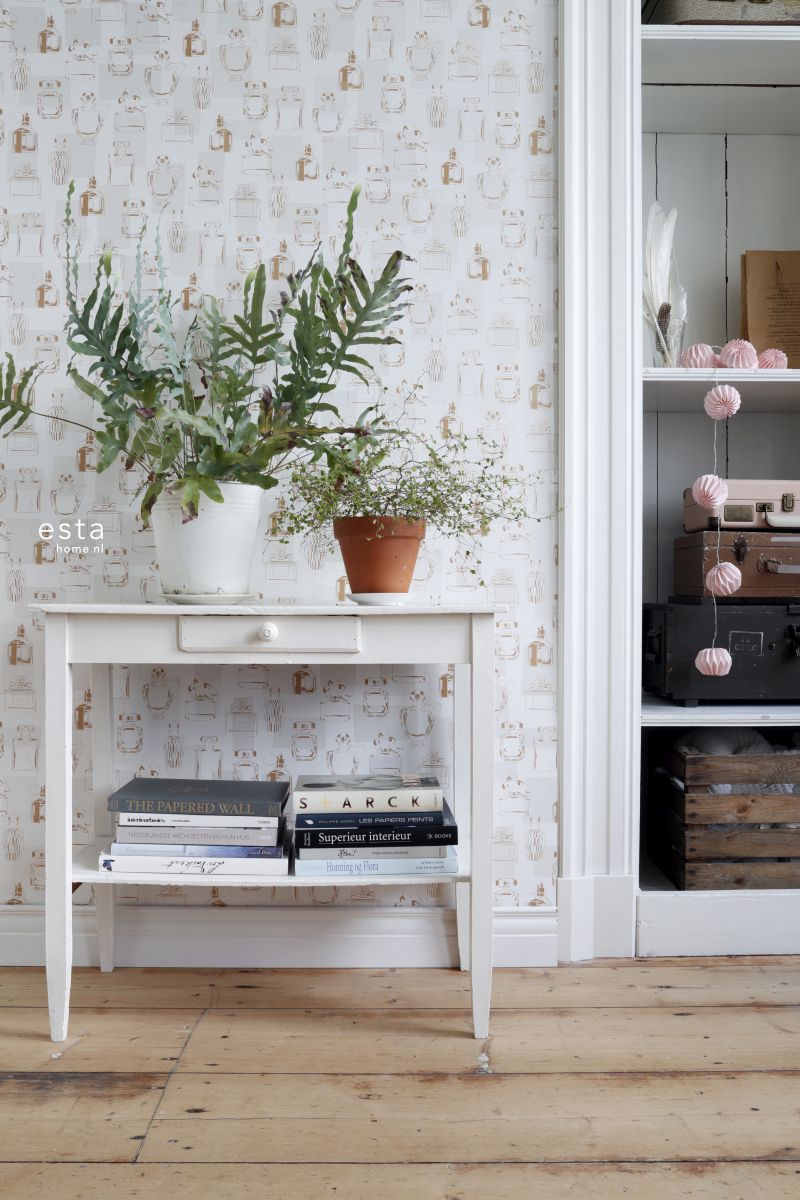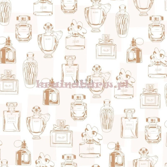 Tapeta z perfumami. W tle znajdują się szare kwadraty. Idealne do pokoju dla nastolatki.