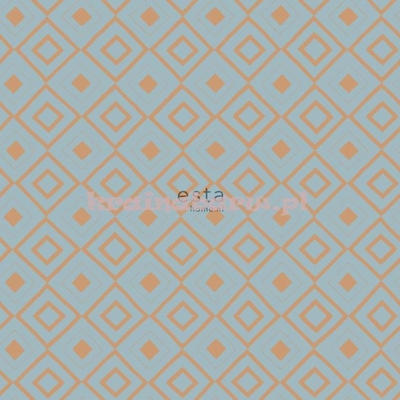Tapeta z geometrycznym wzorem w romby, kwadraty. Złocisto niebieska kolorystyka.