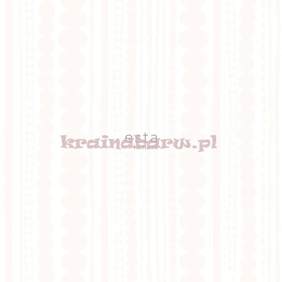 Tapeta w pasy składające się z kółek, kropek i szlaczków. Biało srebrzysta kolorystyka.