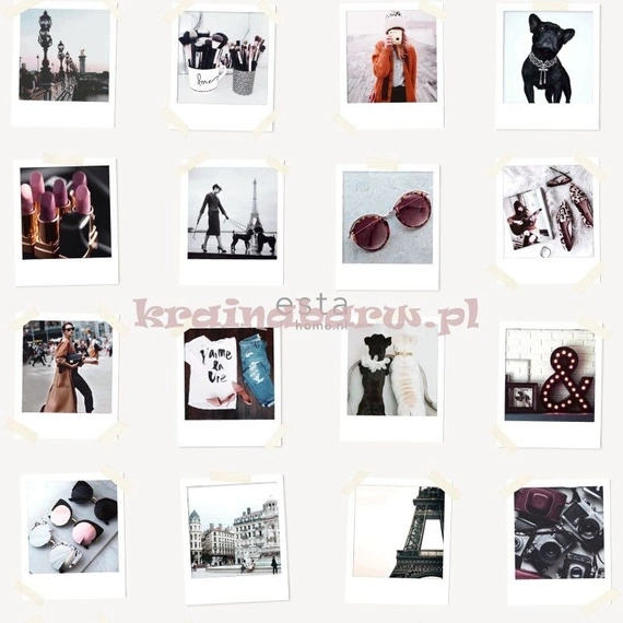 Tapeta z różnymi zdjęciami, które znajdują się na jasno popielatym tle. Idealne do pokoju dla nastolatki.