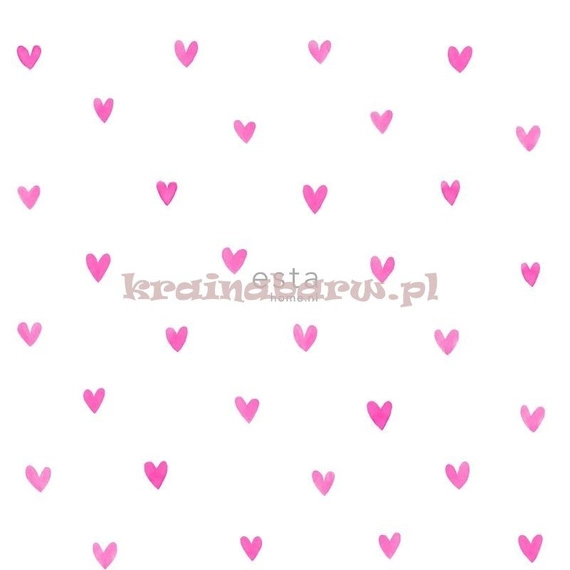 Tapeta z drobnymi różowymi serduszkami. Naniesiono je na białe tło.