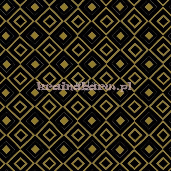 Tapeta z geometrycznym wzorem w romby, kwadraty. Czarno złocista kolorystyka.