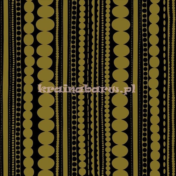 Tapeta w pasy składające się z kółek, kropek i szlaczków. Czarno złocista kolorystyka.
