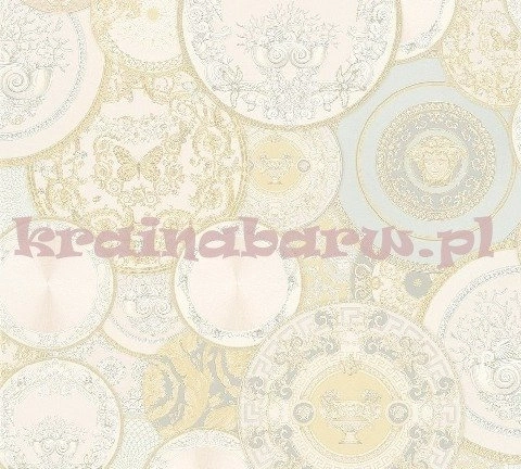 Wyjątkowa tapeta Versace z porcelanowymi talerzami. Doskonała do ekstrawaganckich wnętrz. Wyczuwalna faktura. Na talerzach widać muszelki, korale, ornamenty, motyle oraz wiele innych wzorów. Tapeta o pastelowej kolorystyce. Występują tutaj odcienie błękitu, złocistego beżu i bieli.