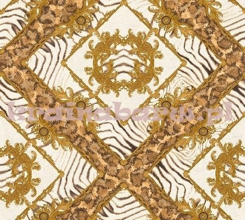 Ekstrawagancka, dzika tapeta. Znajdują się tutaj futra pantery, zebry, połączone z wymyślnym ornamentem, który układa się w romby. Złocisto biała kolorystyka.