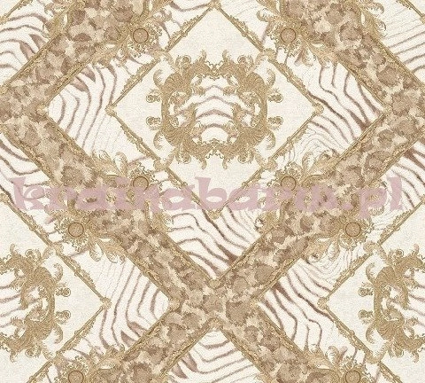Ekstrawagancka, dzika tapeta. Znajdują się tutaj futra pantery, zebry, połączone z wymyślnym ornamentem, który układa się w romby. Odcienie barwy beżowej z połyskiem.