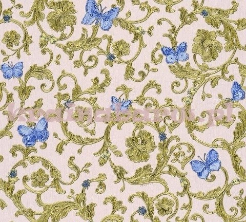 Finezyjny klasyczny ornament z wyróżniającymi się niebieskimi motylami i biedronkami. Naniesiono go na różowe tło w delikatne prążki.