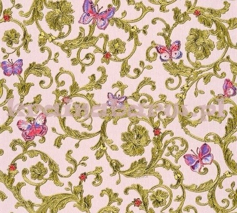Finezyjny klasyczny ornament z wyróżniającymi się kolorowymi motylami i biedronkami. Naniesiono go na różowe tło w delikatne prążki.