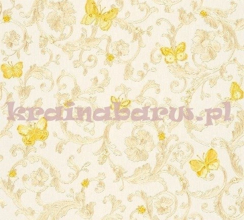 Finezyjny klasyczny ornament z wyróżniającymi się żółtymi motylami i biedronkami. Naniesiono go na kremowo białe tło w delikatne prążki.