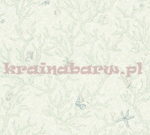 Nietypowa tapeta z przedstawieniem koralowca. Znajdują się tutaj również muszelki morskich ślimaków oraz rozgwiazdy. Kolor jasny błękitny.