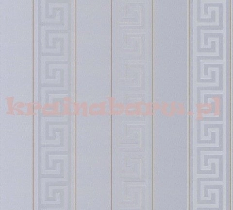 Geometryczna tapeta z wyczuwalnym w dotyku wzorem. Jest on inspirowany malunkami ze starożytnych greckich waz. Układa się on na tapecie w poziomych pasach. Kolor srebrny.
