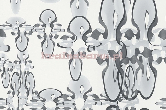 Tapeta z wzorem, który przypomina rozlany atrament. Tworzy on abstrakcyjny wzór. Jest on w odcieniach popielatej szarości i czerni. Naniesiono go na białe tło o wyczuwalnej fakturze.
