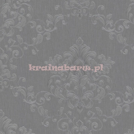 Tapeta z kwiecistym ornamentem. Jest on naniesiony na tło o fakturze przypominającej tkaninę. Szara kolorystyka.