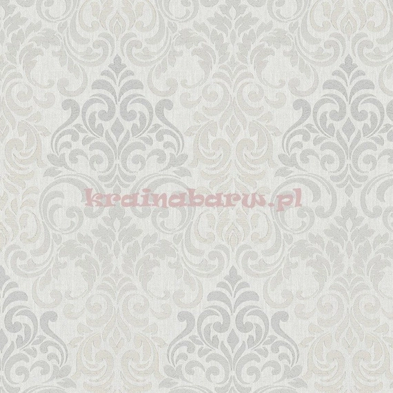 Tapeta z kwiecistym ornamentem. Jest on naniesiony na tło o fakturze przypominającej tkaninę. Ornament mieni się w odcieniach koloru srebrnego i złotego. Tapeta w szarawej kolorystyce.