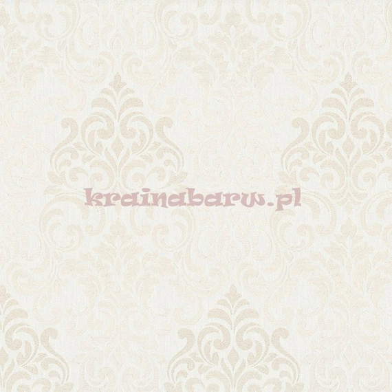 Tapeta z kwiecistym ornamentem. Jest on naniesiony na tło o fakturze przypominającej tkaninę. Ornament mieni się w połyskującym beżu. Tapeta w kremowo beżowej kolorystyce.