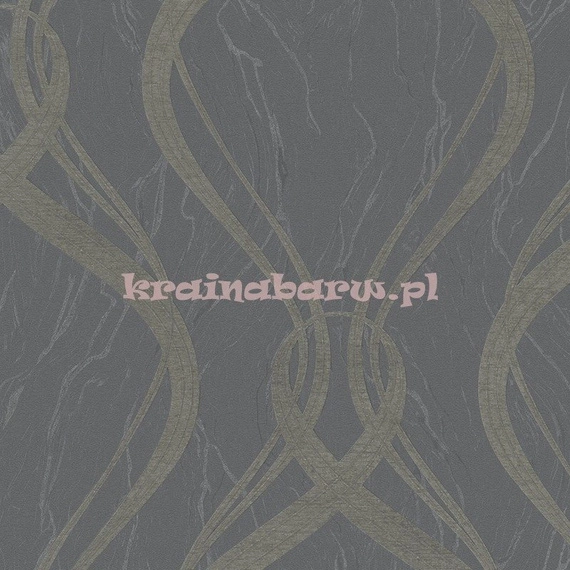 Tapeta z falistym wzorem. Jest on w połyskującym, złotym kolorze. Znajduje się na grafitowym tle.