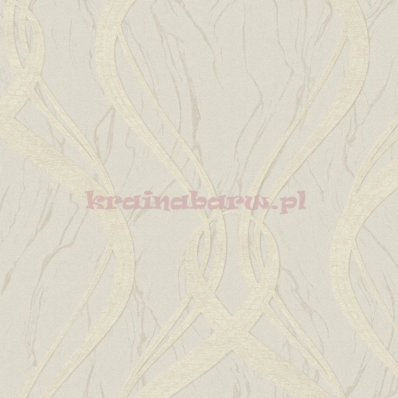 Tapeta z falistym wzorem. Jest on w połyskującym, złotym kolorze. Znajduje się na kremowym tle.