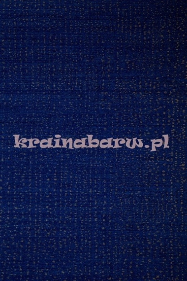 Tapeta o fakturze tkaniny w drobne pionowe prążki. Niebieskie tło jest pokryte złotymi, połyskującymi plamkami.