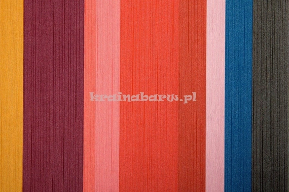 Tapeta o fakturze tkaniny w pasy. Wyczuwalne w dotyku pionowe prążki. Tapeta jest w odcieniach czerwieni, zieleni, niebieskiego, szarości i różu.