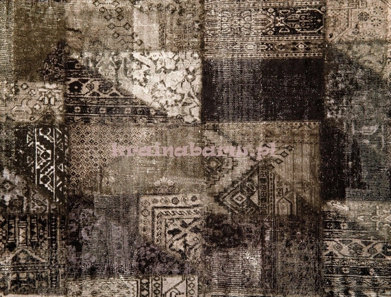 Tapeta z motywem przypominającym egzotyczny dywan. Widać tutaj wzory geometryczne i szlaczki. Wyczuwalna faktura przypomina splot tkaniny. Ciemna, szara kolorystyka.