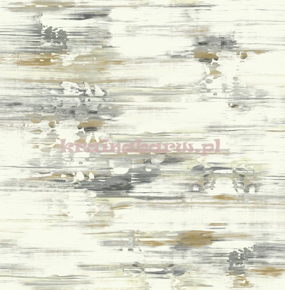 Wielokolorowa tapeta z układającym się pionowo wzorem. Beżowo szarawa kolorystyka z odrobiną złotego.