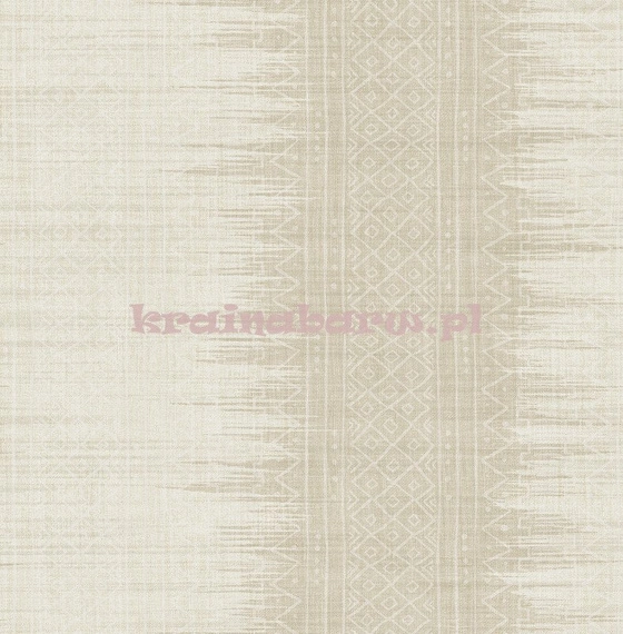 Na tapecie znajduje się nowoczesny, geometryczny wzór. Składają się na niego poszarpane pasy, drobne romby, paski i kropki. Beżowa kolorystyka.