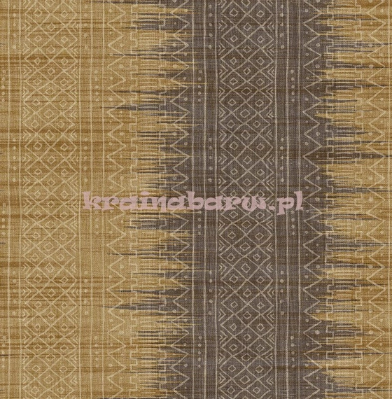 Na tapecie znajduje się nowoczesny, geometryczny wzór. Składają się na niego poszarpane pasy, drobne romby, paski i kropki. Brązowo złocista kolorystyka.