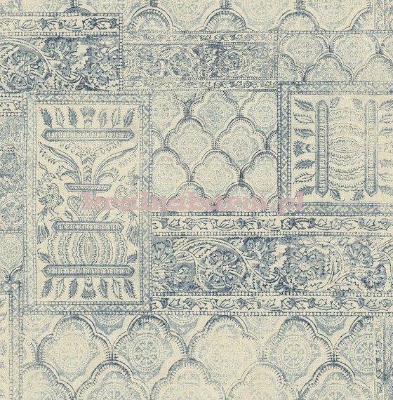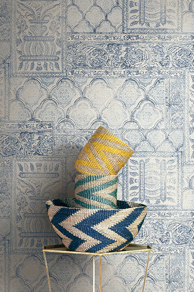 Tapeta z kwiatkami i ornamentami w stylu retro. Przeważa na niej kolor niebieski.