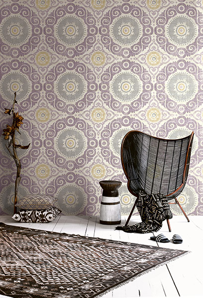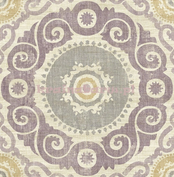 Tapeta z okrągłym ornamentem. Przeważa szarawo fioletowa kolorystyka.