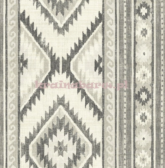 Tapeta o wzorze przypominającym ręcznie haftowaną tkaninę. Widoczny wzór układa się w trójkąty i pasy. Szarawa kolorystyka.