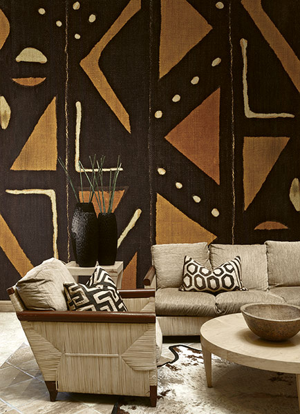 Winylowy mural o etnicznym wzorze. Łączy on tradycyjne afrykańskie wzornictwo z nowoczesnością. Czarno pomarańczowa kolorystyka.