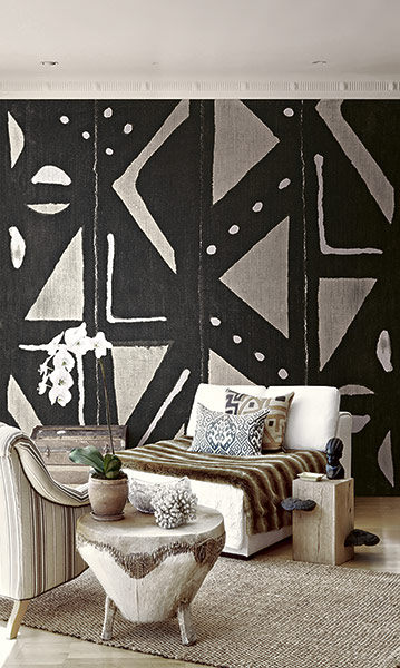 Winylowy mural o etnicznym wzorze. Łączy on tradycyjne afrykańskie wzornictwo z nowoczesnością. Czarno biała kolorystyka.
