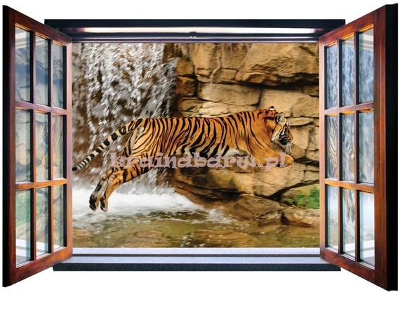 Widok przez otwarte okno , na skały, wodospad i skaczącego tygrysa.