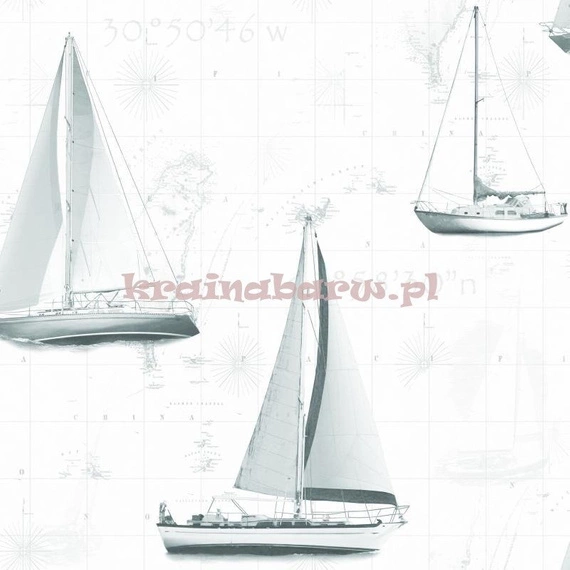 Marynistyczna tapeta ze wzorem w jachty. Łodzie są naniesione na tło w mapę mórz i oceanów. Biało szara kolorystyka.