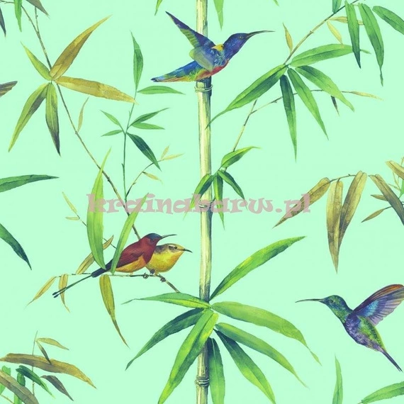 Tapeta z tropikalną roślinnością. Znajdują się tutaj łodygi bambusa i przelatujące między nimi kolorowe kolibry. Tło tapety jest w błękitnym/turkusowym kolorze. Na naniesionym wzorze przeważa barwa zielona.