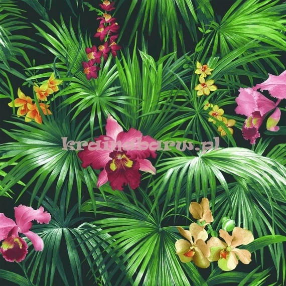 Tapeta z tropikalną roślinnością. Znajdują się tutaj czerwone i żółte orchidee/storczyki oraz egzotyczne liście. Przeważa na niej zielona kolorystyka.