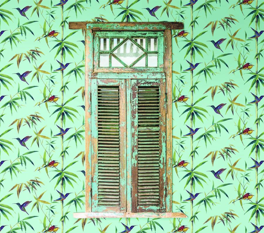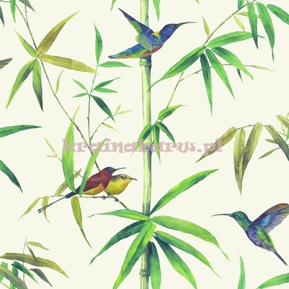 Tapeta z tropikalną roślinnością. Znajdują się tutaj łodygi bambusa i przelatujące między nimi kolorowe kolibry. Tło tapety jest w białym kolorze. Na naniesionym wzorze przeważa barwa zielona.