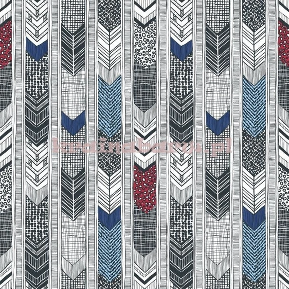 Tapeta z etnicznym geometrycznym wzorem, układającym się w pasy. Czarno biała kolorystyka z dodatkiem niebieskiego i czerwieni.
