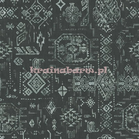Tapeta z drobnym etnicznym geometrycznym wzorem, układającym się w pasy. Składa się z małych kwadratów, kropek i kresek. Kolor czarny.